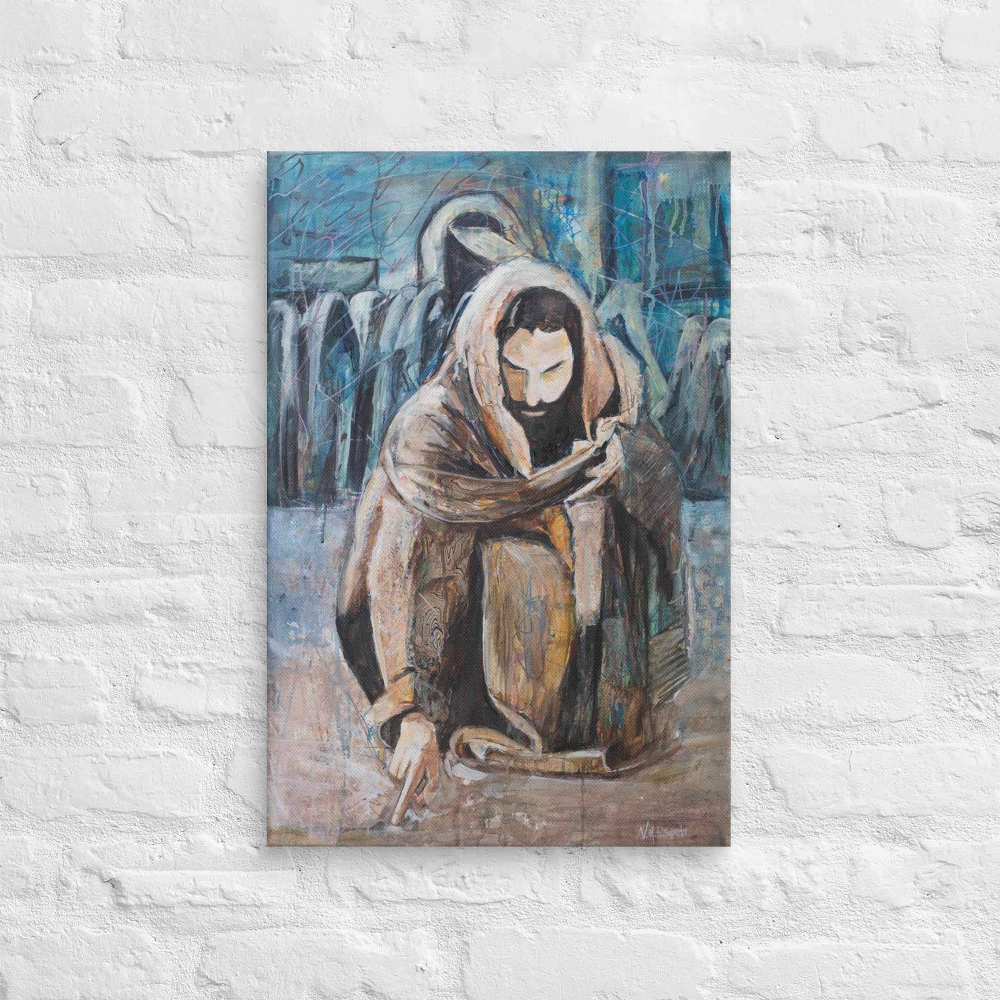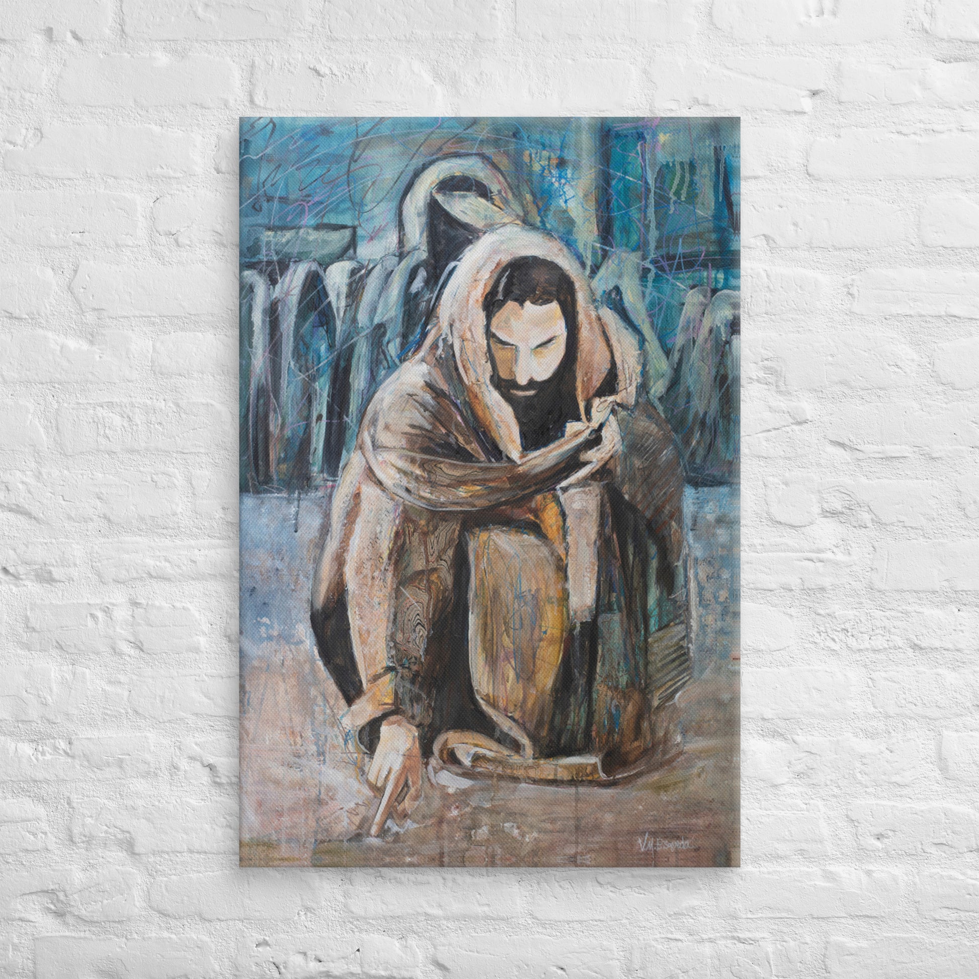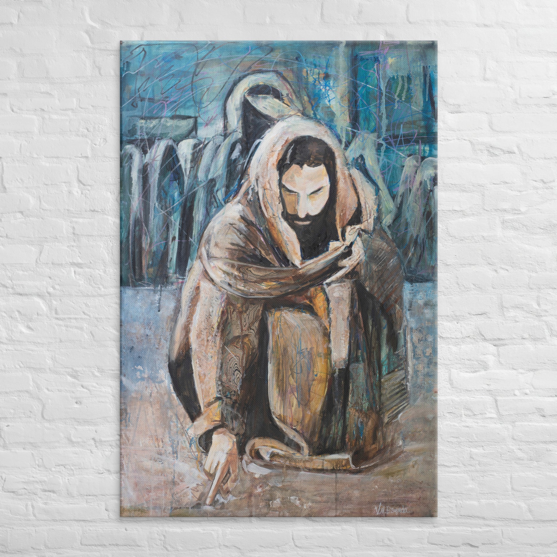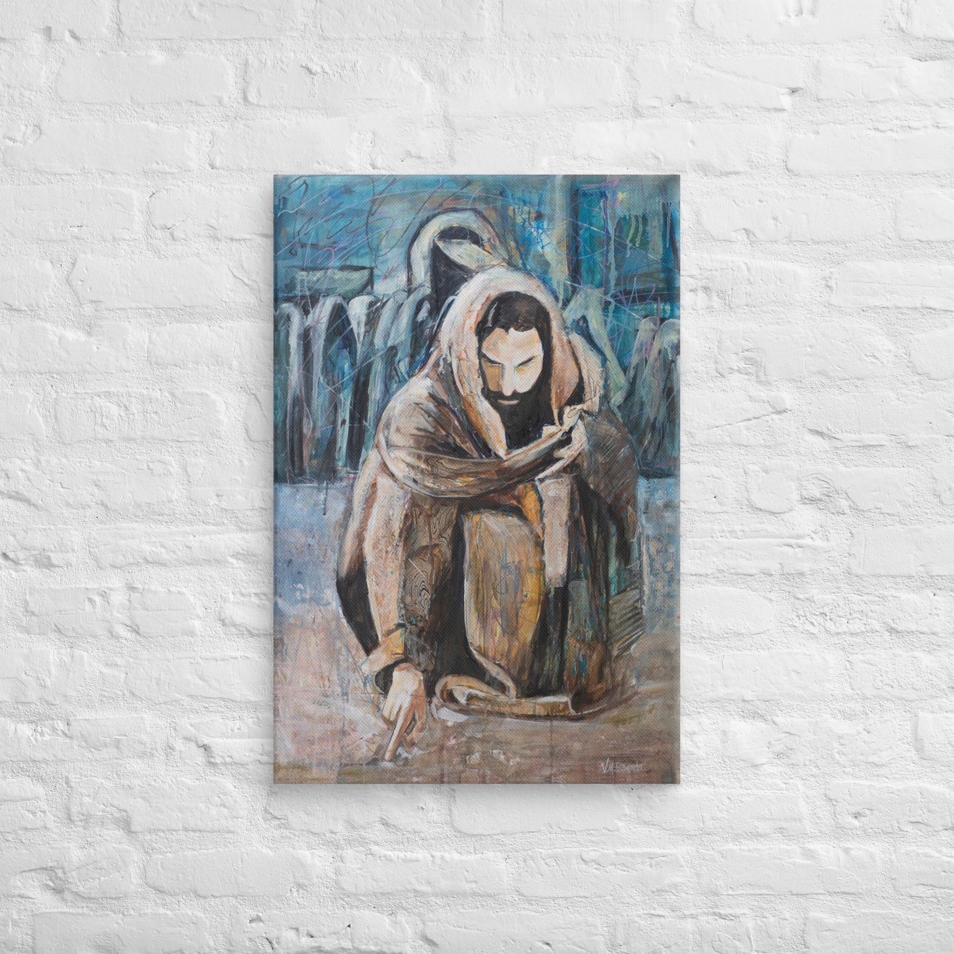 Print of an original mixed media painting depicting the intercession of Jesus on behalf of the Harlot, Mary Magdalen. In the Gospel of John 8:7, Jesus bent down and wrote with his finger on the ground . When the scribes and pharisees questioned Him, He straightened up and said to them, "Let anyone among you who is without sin be the first to cast the stone at her."