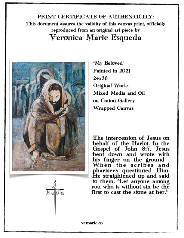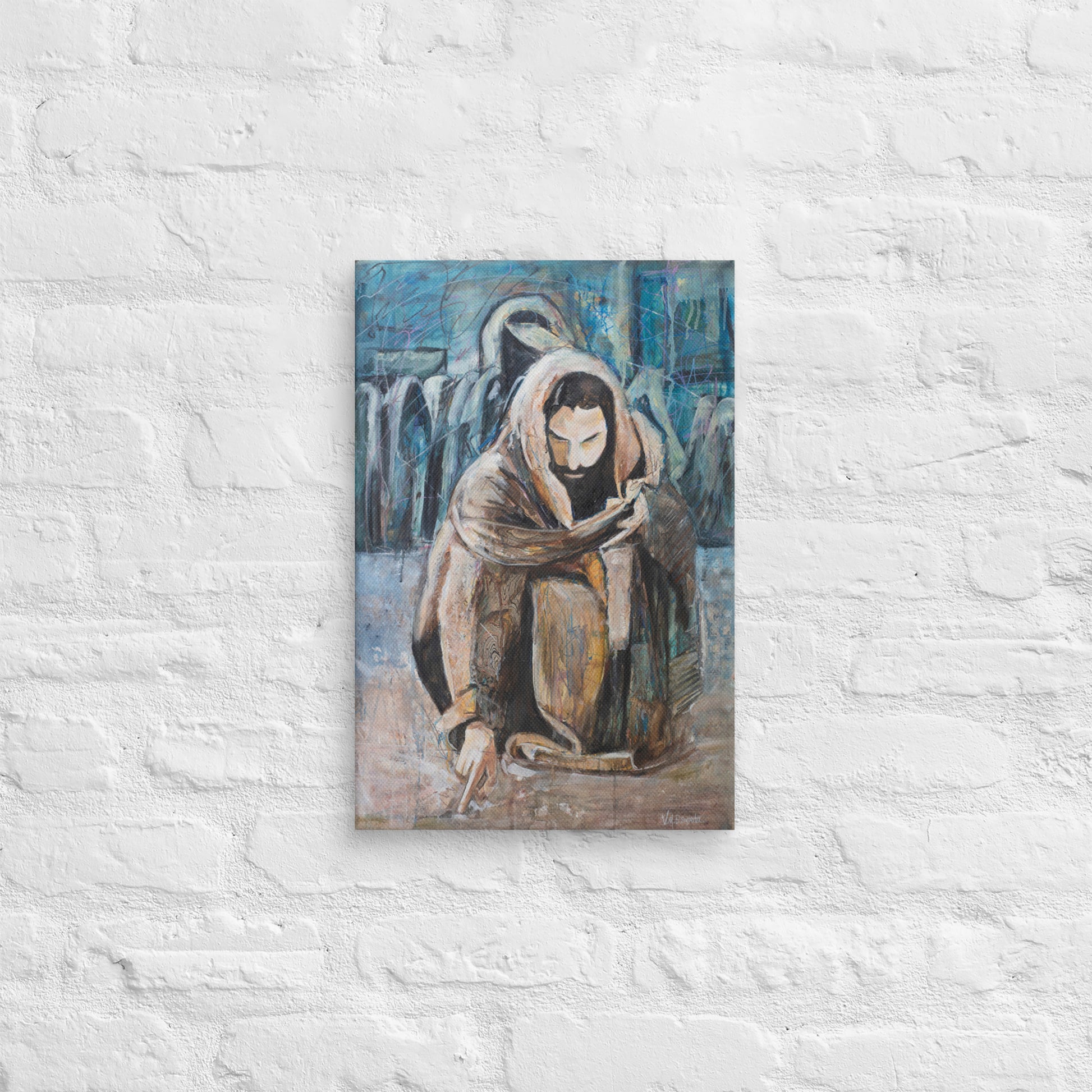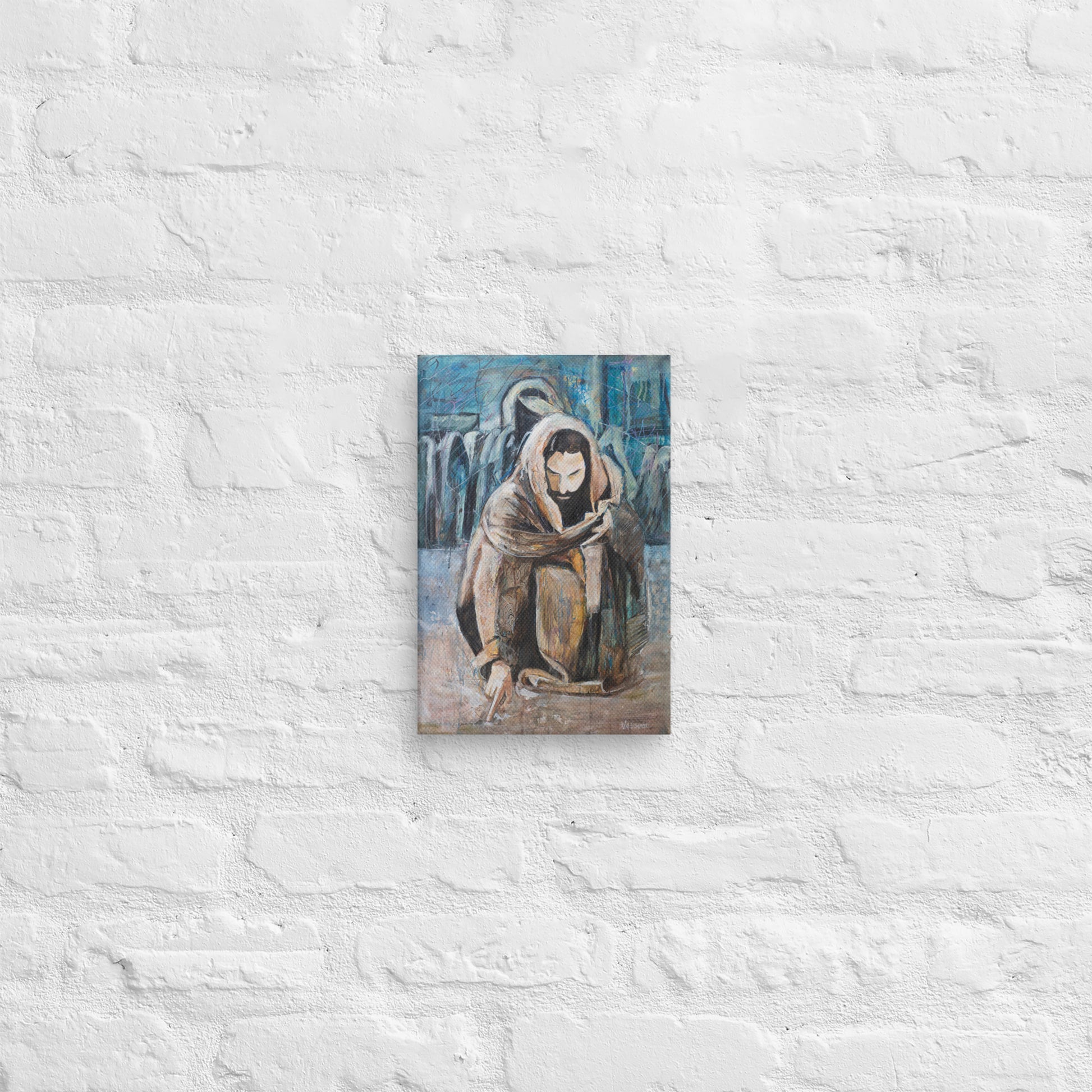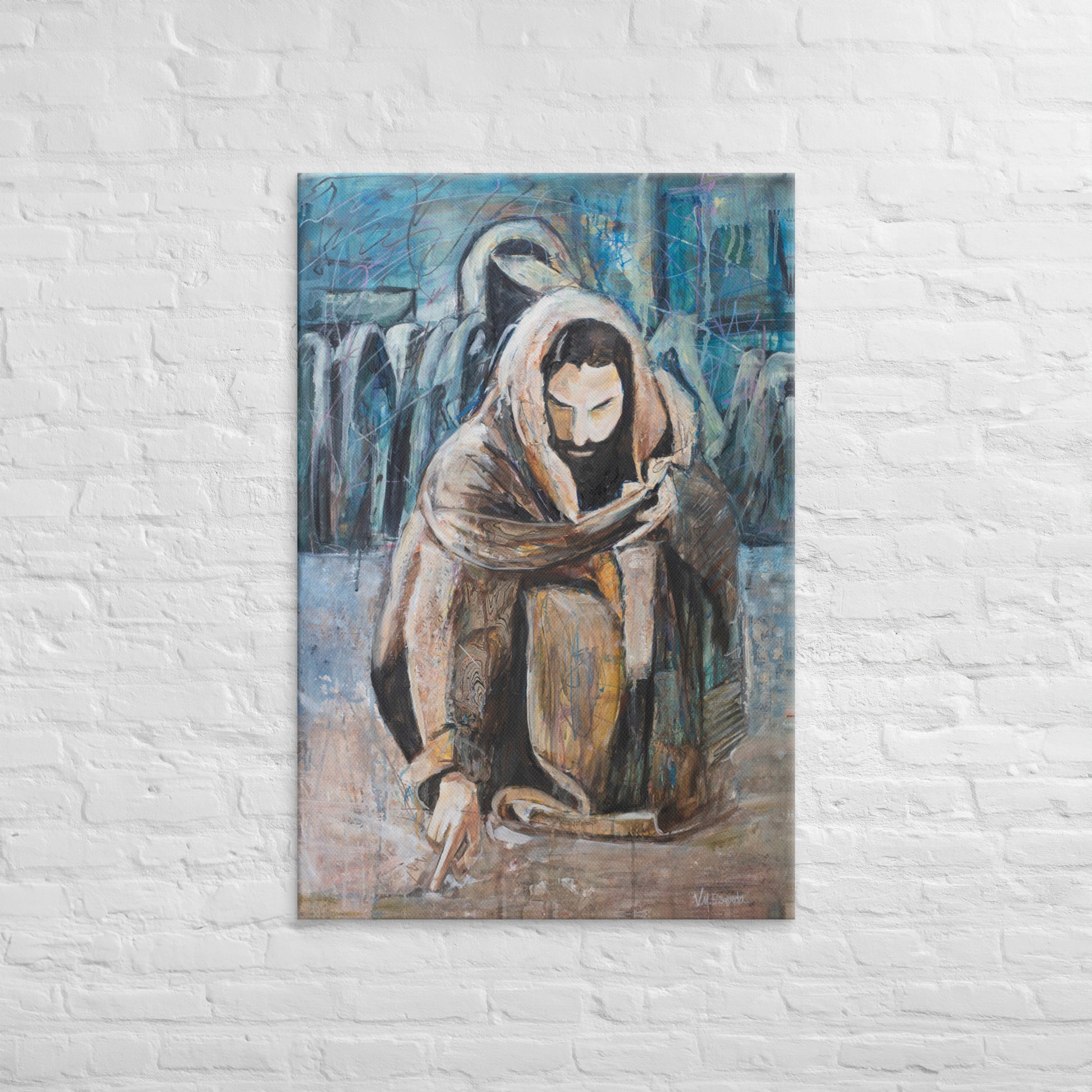 Print of an original mixed media painting depicting the intercession of Jesus on behalf of the Harlot, Mary Magdalen. In the Gospel of John 8:7, Jesus bent down and wrote with his finger on the ground . When the scribes and pharisees questioned Him, He straightened up and said to them, "Let anyone among you who is without sin be the first to cast the stone at her."